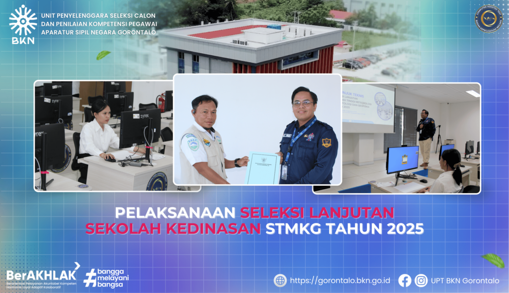 Terdapat satu peserta dalam seleksi lanjutan STMKG untuk titik lokasi UPT BKN Gorontalo. Rangkaian Kegiatan dimulai sejak 09.00 s.d. 12.00 WITa. Durasi ujian berlangsung selama 90 menit dan skor peserta mencapai angka 230.